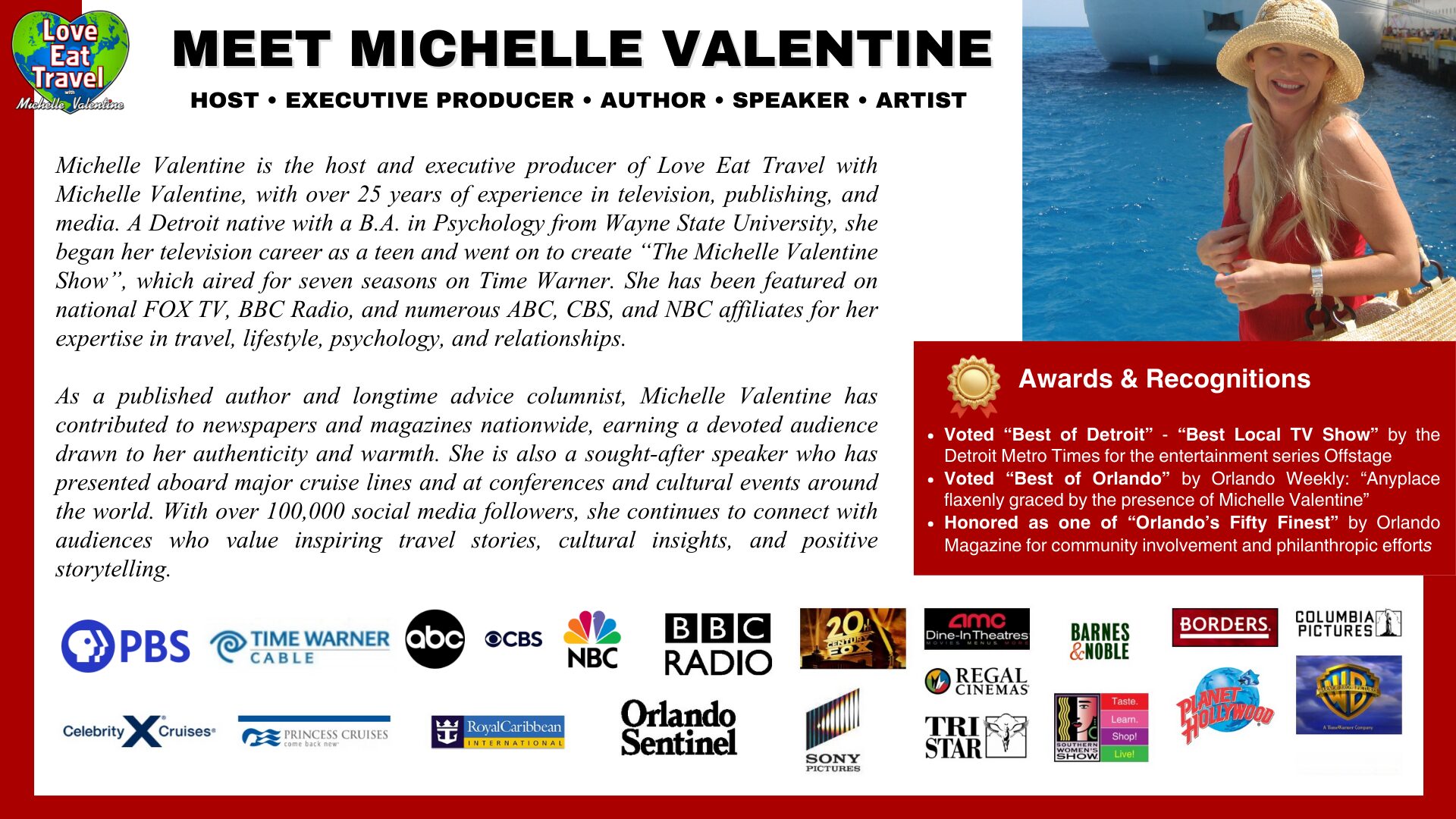 A respected speaker, Michelle Valentine continues to present engaging seminars aboard Royal Caribbean, Princess, and Celebrity cruise lines. She also regularly speaks at international events, festivals, and conventions, where she shares her insights on psychology, business, the arts, and travel. Her presentations are known for being both educational and inspiring, drawing from her diverse background in media, travel, and personal development.