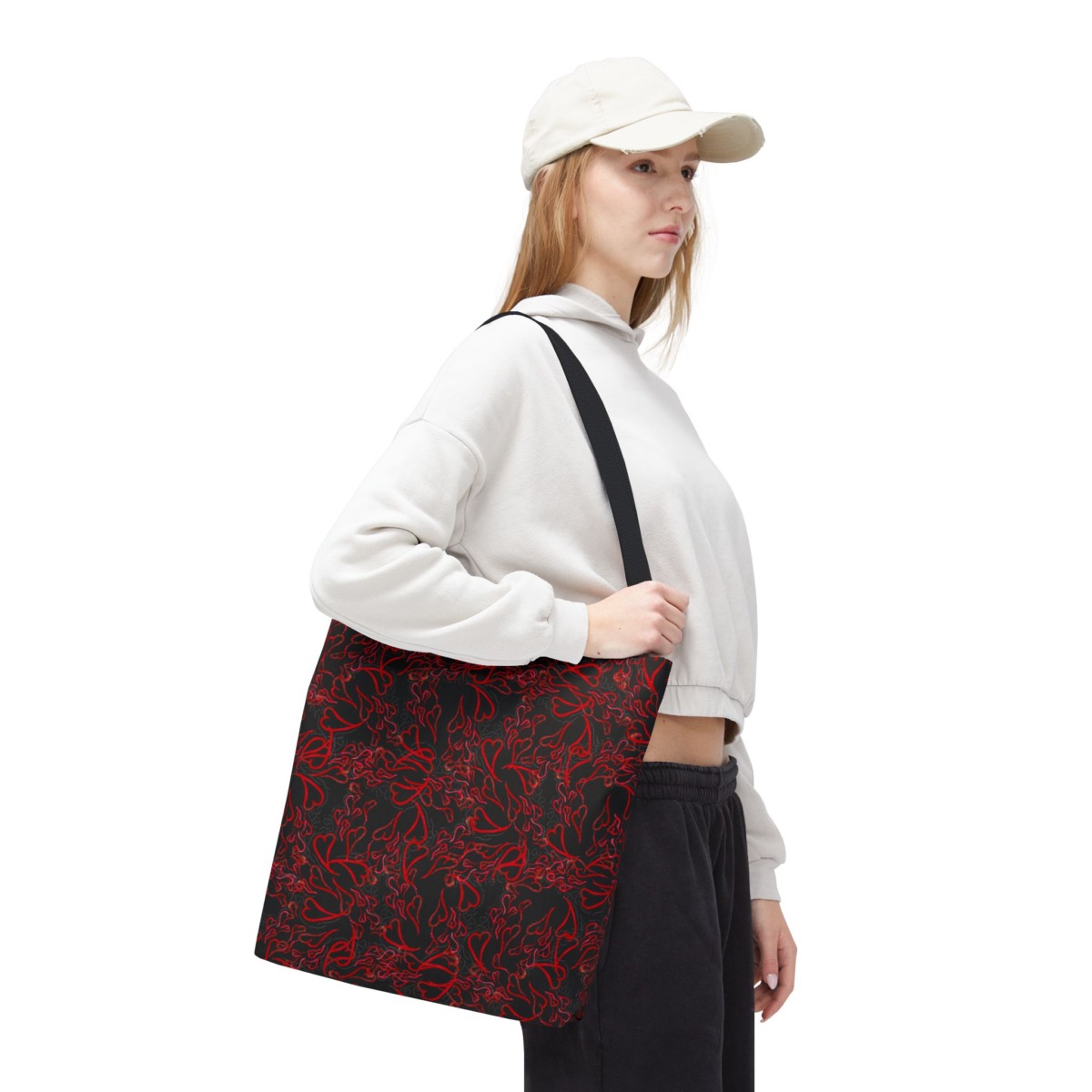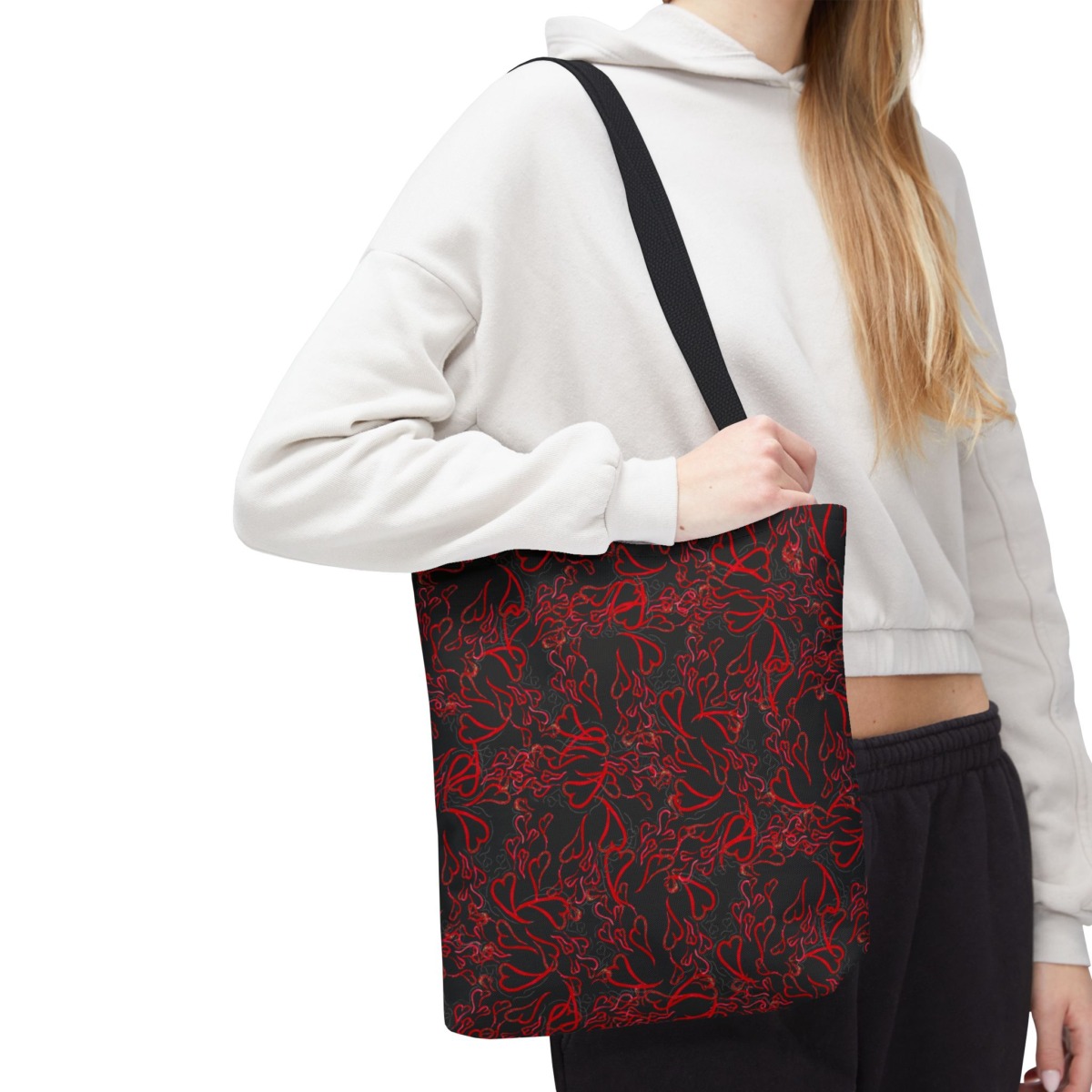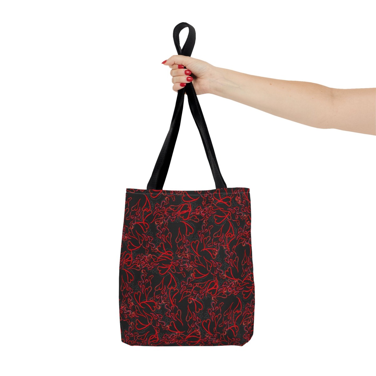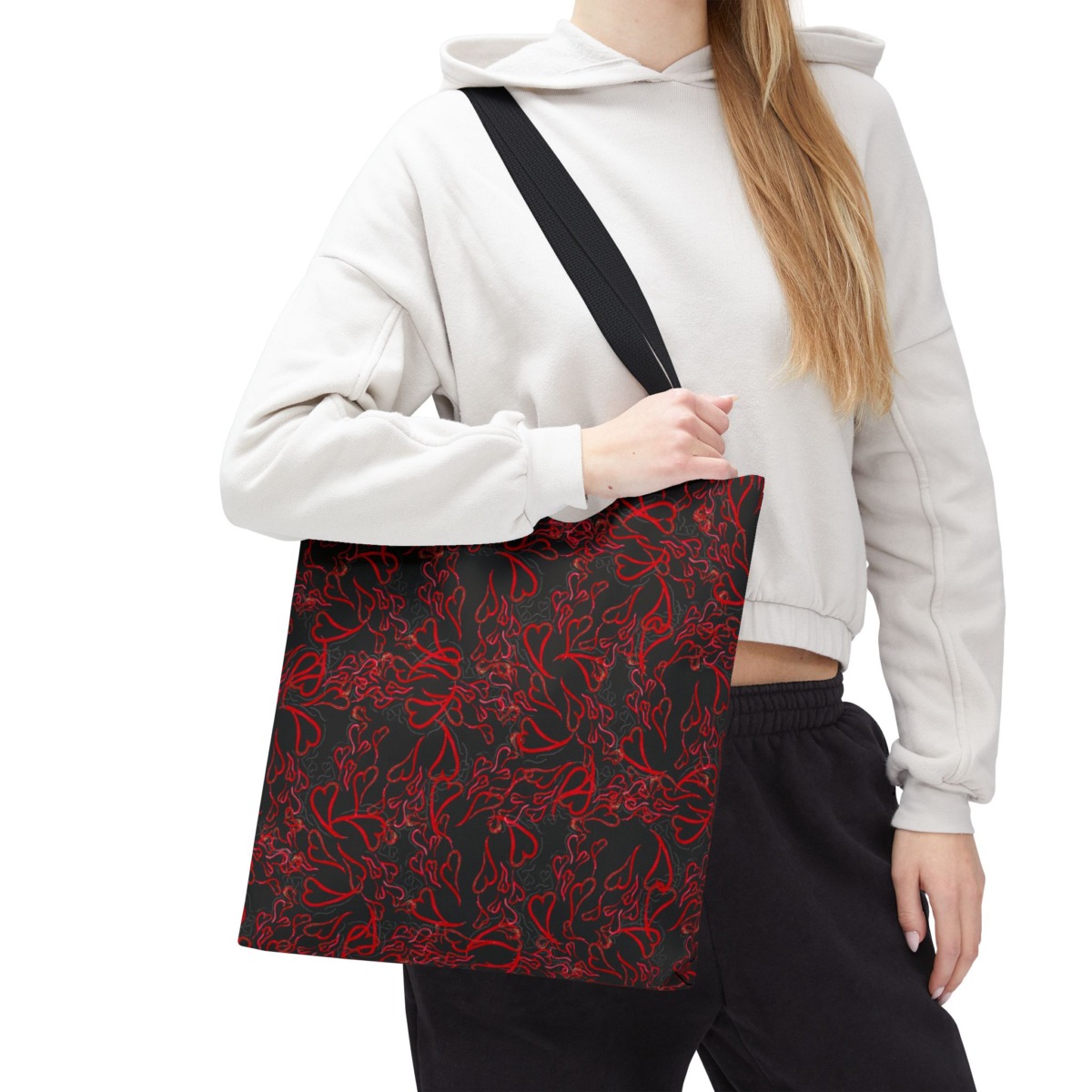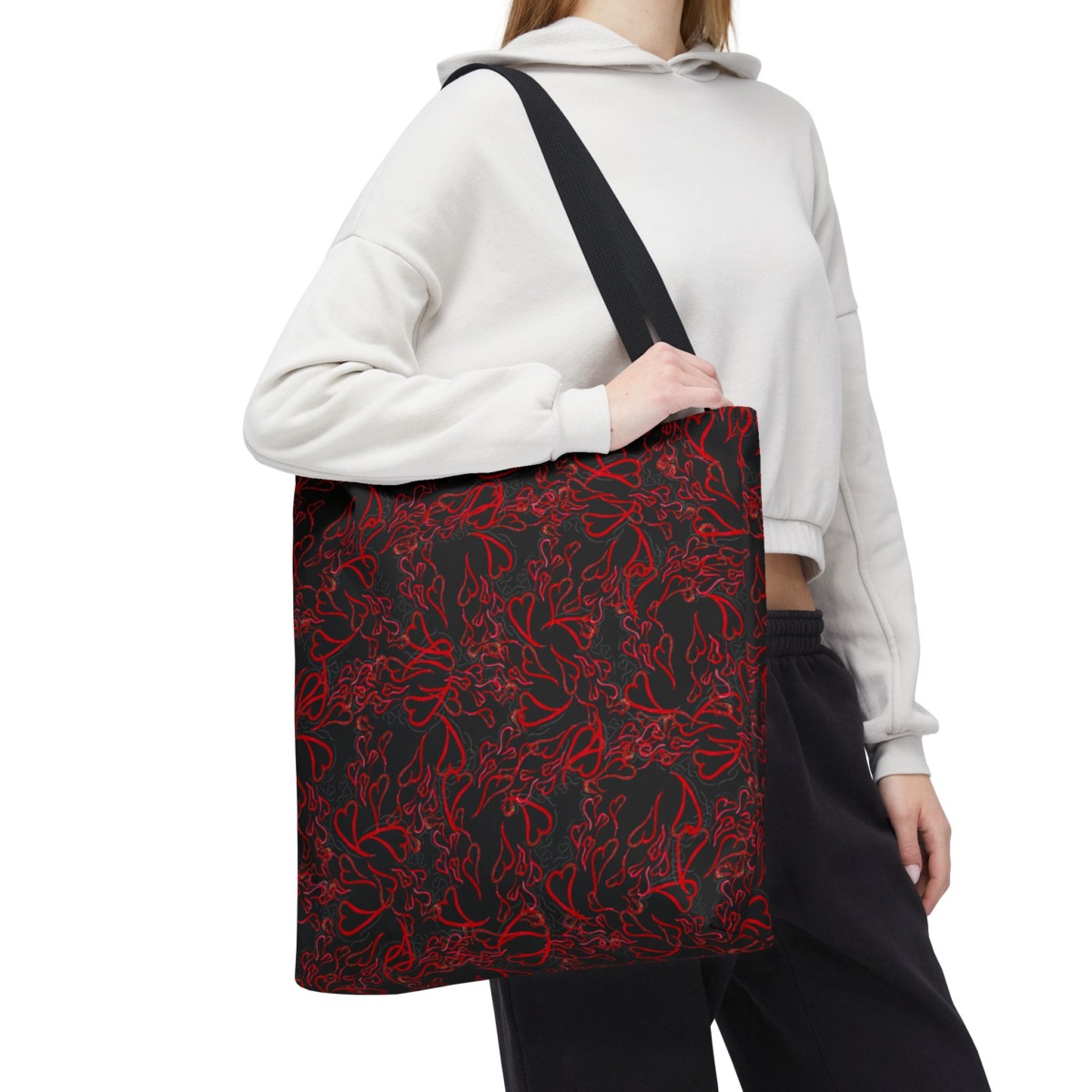 Michelle Valentine “Flying Hearts” Tote Bag (black) is a chic and spacious carryall featuring eye-catching original artwork by Michelle Valentine. With durable construction and comfortable handles, this stylish black tote is perfect for travel, errands, work, or everyday use—bringing a bold, romantic flair and artistic energy to your look.